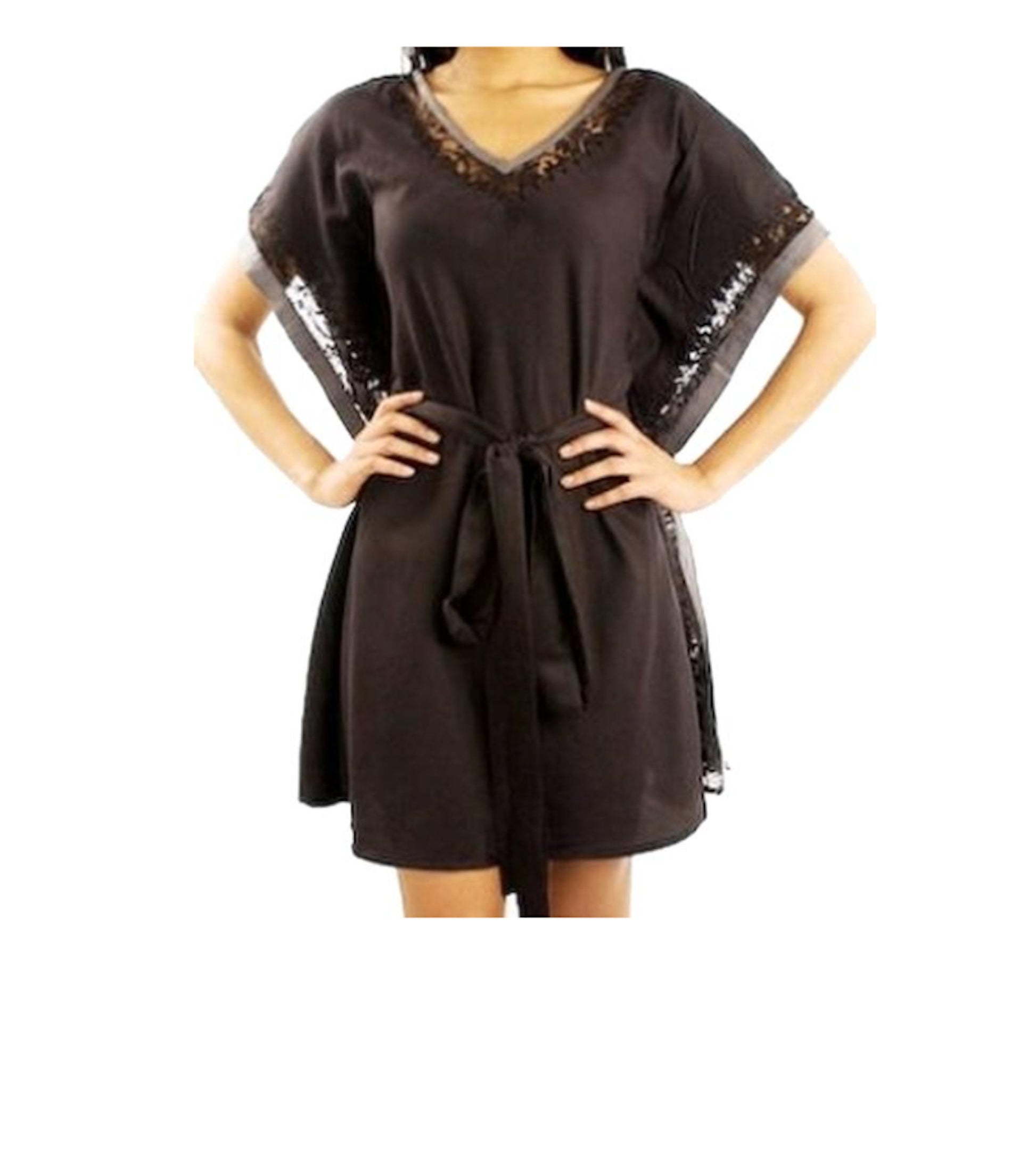 You will feel confident and stylish in this sexy black dress. Talk about one of a kind! True to true kimono stylings, this dress is loose-fitting and knee length for a unique look that will be sure to turn heads. Sexy lace lined V neckline in the front and back of the dress. Super cute lacy flutter kimono sleeves that appear to flow on and on. Long sash is removable and ties in the front or back helping accentuate the narrowest part of the body. Super soft and luxurious fabric that you will love wearing. Dress is NOT lined. Because the item is made of unique material blend it has very little stretch though it is loose fitting in the first place. Great for standing out from the crowd at concerts, clubs or any evening occasion. Look simply fabulous no matter the occasion with this dress.
